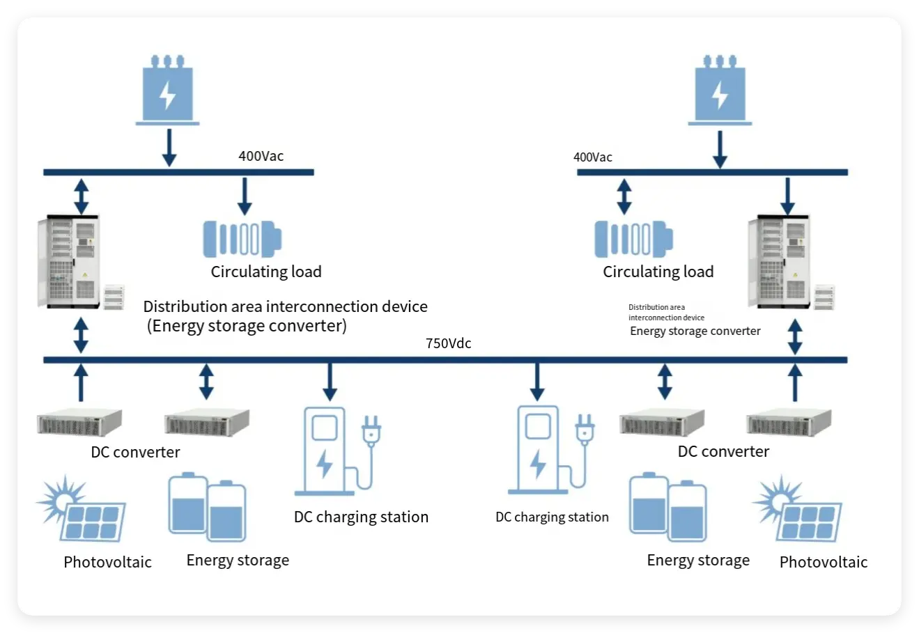 The low-voltage distribution network flexible mutual assistance solution highly integrates the discharge system, the power transformation and distribution system and the power consumption equipment through energy conversion devices. By interconnecting through the low-voltage flexible DC bus and leveraging the edge computing function of the intelligent fusion terminal of the transformer area, real-time monitoring and control of the equipment within the system can be achieved, and energy dispatching strategies for the interconnected system can be formulated. This can effectively solve the stability operation and power quality problems caused by the large-scale integration of distributed photovoltaic and electric vehicles, and enhance the power supply reliability of the transformer area.