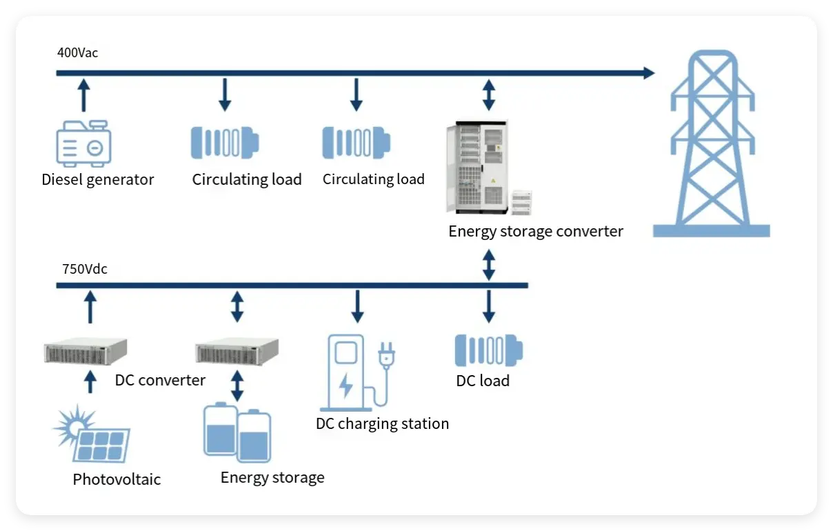 In a multi-energy complementary power supply system that includes photovoltaic, wind power, diesel generators or public power grids, the power balance and stable operation control of the microgrid system can be achieved through the supporting energy storage system. This is applicable not only to islands, mountainous areas, border outposts and other remote or unstable power supply areas, but also to the energy optimization system of new science and technology parks with photovoltaic, energy storage and charging.