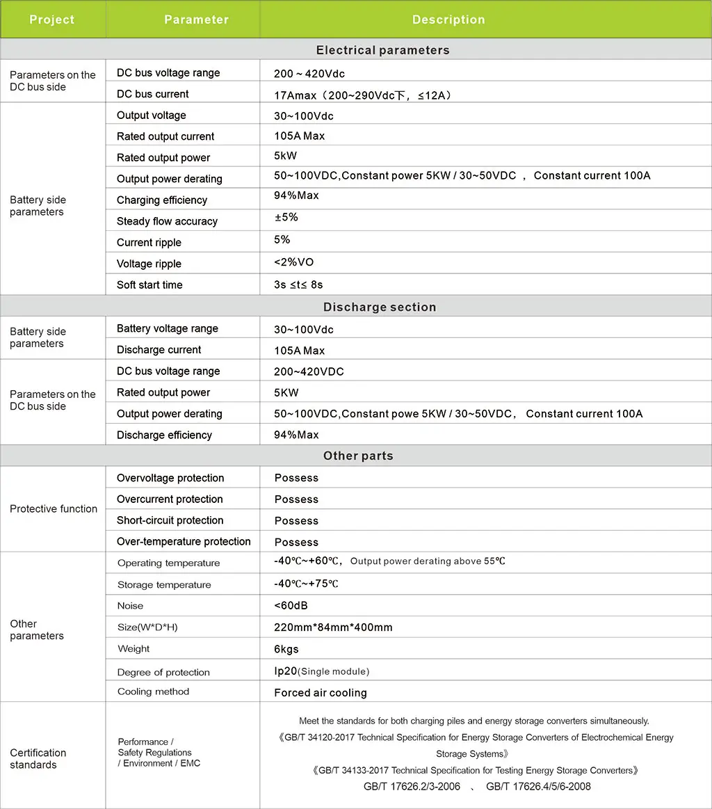 The IBDC10050 power module is a DC/DC bidirectional conversion power module with a battery side voltage range of 30 to 100Vdc and a bus side voltage range of 200 to 420 Vdc. The power module features DC reverse connection protection, overcurrent protection, overvoltage protection, over-temperature protection, short circuit protection, and supports up to 32 units for parallel