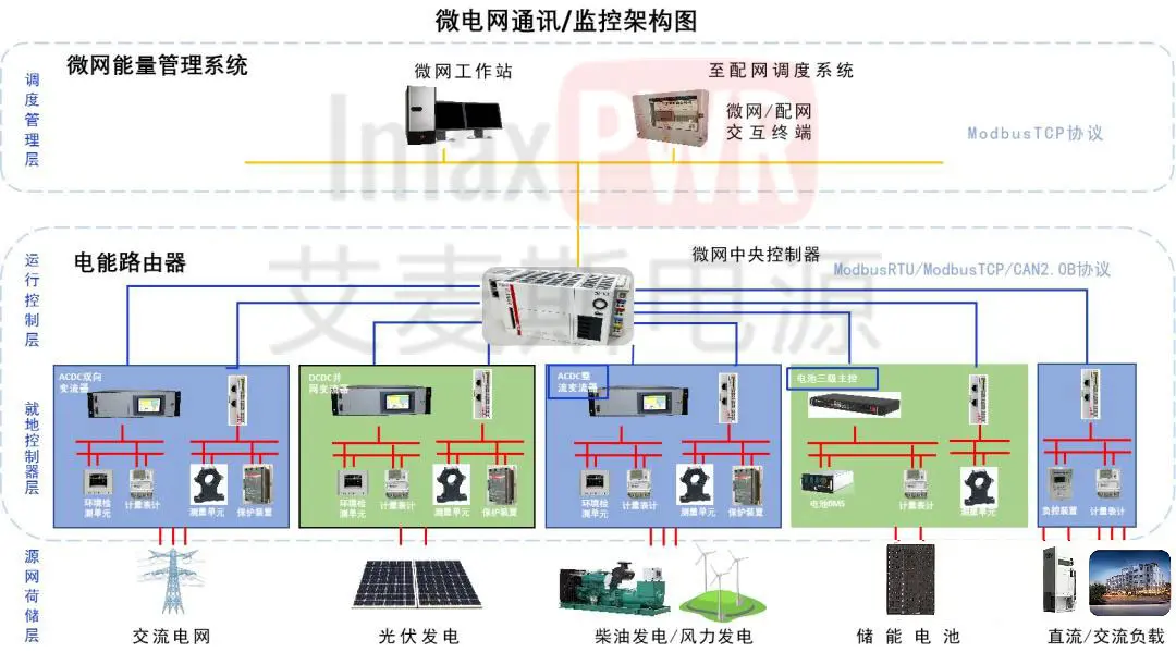 The central controller is used to monitor and control each source device within the power router, achieving functions such as grid connection, off-grid operation, grid connection/off-grid switching operation (optional), fault protection, data storage and display for the photovoltaic-storage-direct-flexible (microgrid) system based on the power router. The system architecture is shown in the following figure.