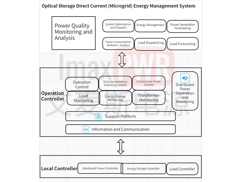 Multi-directional energy control, as the core of a microgrid, flexibly connects photovoltaic, energy storage, power grid and load through converters to achieve AC/DC networking. It actively regulates power flow based on algorithms to maximize the local consumption of clean energy. The monitoring and management system of the photovoltaic-storage-direct-flexible (microgrid) system is designed for unmanned operation (with few personnel on duty). Due to the small installed capacity and low grid connection voltage level, dispatch management is not considered. An industrial embedded controller is used as the operation controller of the photovoltaic-storage-direct-flexible (microgrid) system to control the local controllers (such as converters and equipment controllers) of the photovoltaic system, battery energy storage system, charging piles and intelligent perception devices, and transmit the corresponding status and fault signals to the photovoltaic-storage-direct-flexible (microgrid) system energy management software (deployed on the energy management platform).