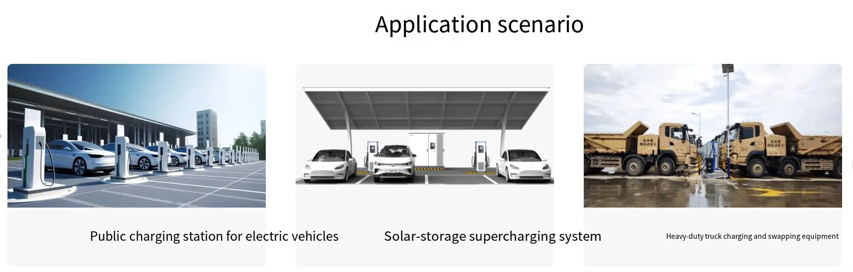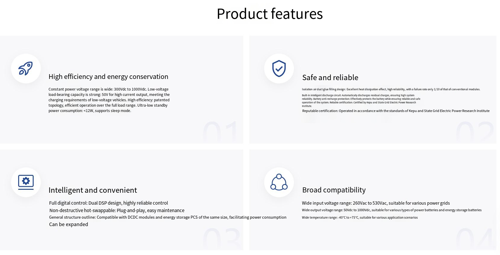 Wide constant power voltage range: 300Vdc to 1000Vdc constant power output. Strong low-voltage load capacity: 50V large current output, meeting the charging requirements of low-voltage vehicles. High efficiency: Patented topology, efficient operation throughout the full load range. Ultra-low standby power consumption.