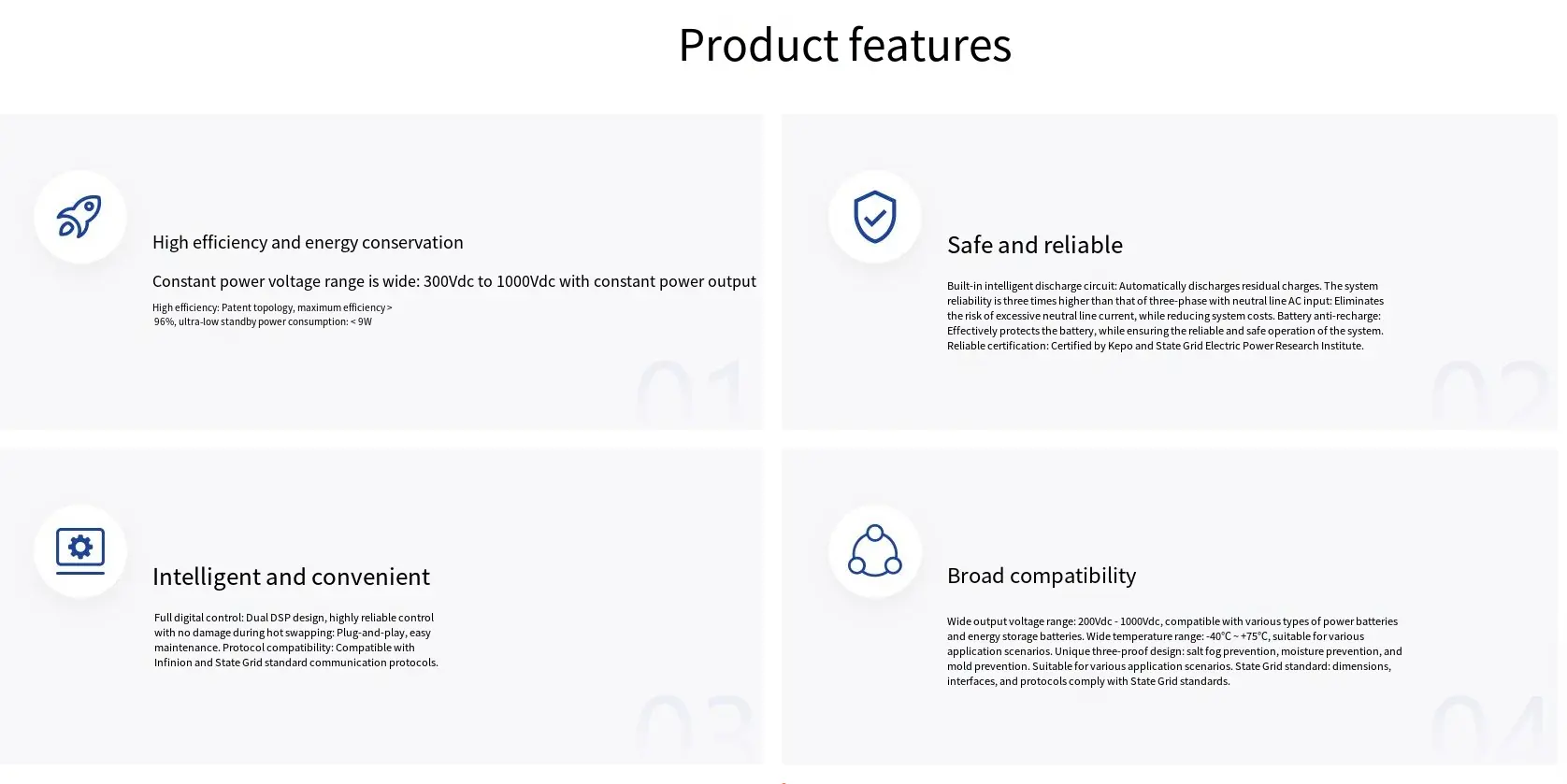 Wide constant power voltage range: 300Vdc ~ 1000Vdc constant power output high efficiency: patented topology, maximum efficiency >96% ultra-low standby power consumption